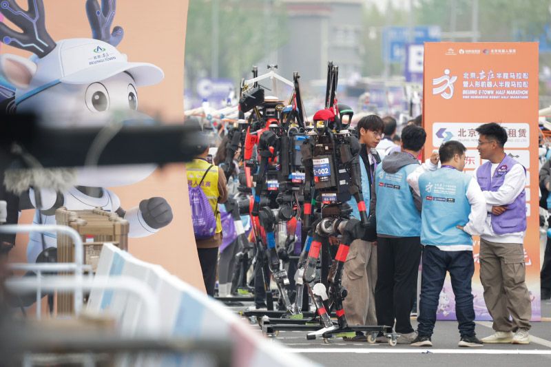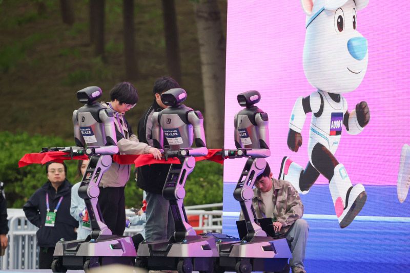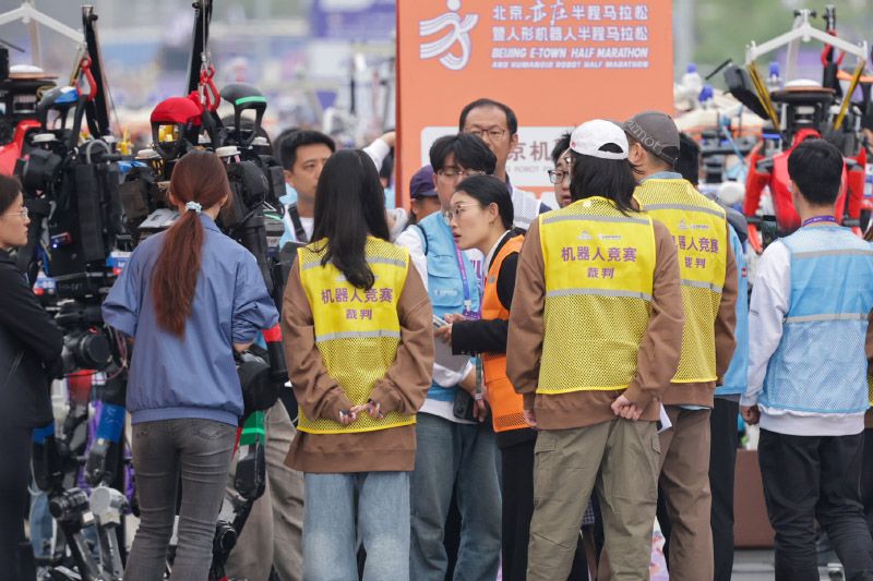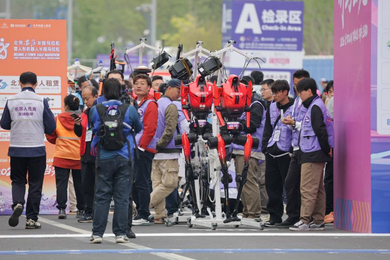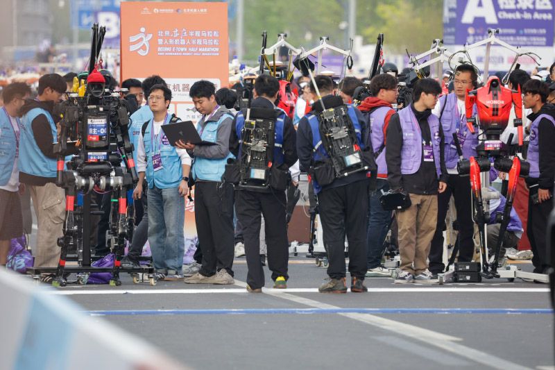 4月19日早晨,工作人员调试机器人礼仪官。2026 北京亦庄半程马拉松暨人形机器人半程马拉松于今日 7:30在亦庄鸣枪开跑,机器人和运动员同一赛道、同时起跑。