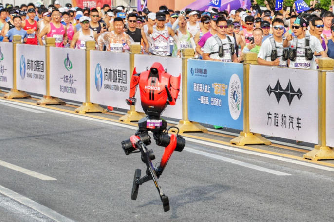 荣耀机器人战队的“闪电”第一个起跑。作为速度型选手,“闪电”的有效腿长达到0.95米,搭载一体化关节模组,奔跑时“迈步大、跑得快”。